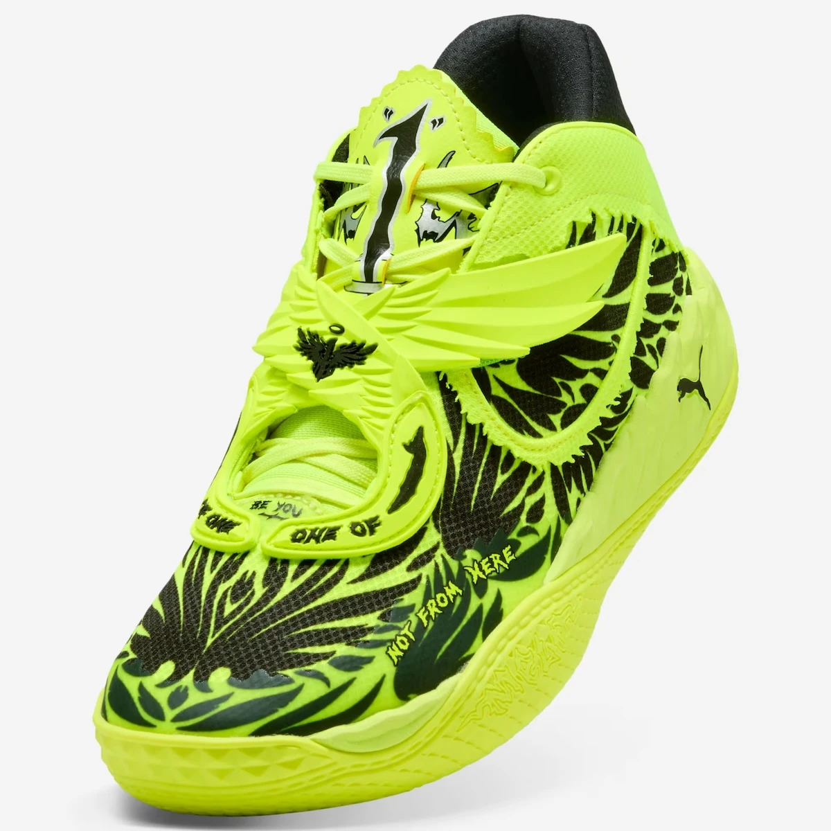 Nuansa elektrik langsung mendominasi desain, dengan warna neon yang muncul di mesh, unit sol, sampai TPU strap bertekstur. Detail logo tersebar di berbagai sisi, memperkuat karakter bold dari siluet ini. Warna Yellow Alert/PUMA Black bikin sneaker ini makin standout, sekaligus nunjukin kalau PUMA nggak takut keluar dari pakem seri “Not From Here” dan masuk ke ranah baru yang lebih eksperimental.